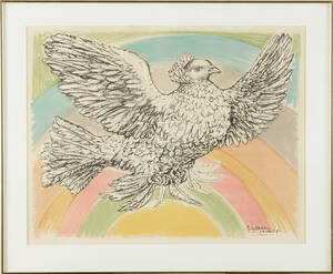 PABLO PICASSO (Spanien 1887-1985): Colombe volant - à l´Arc en ciel, 10.10.52, signerad i trycket, färglitografi, bildmått ca 49x65 cm. Något gulnad. Läs mer...