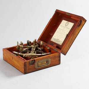SEXTANT, mässing, 1900-talets början, signerad J. Coombes, Devonport, nr. 8270, med tillbehör och certifikat utfärdat 1913 i mahognyfodral, längd 22 cm. Etui med spricka, några tillbehör saknas i etuiet.