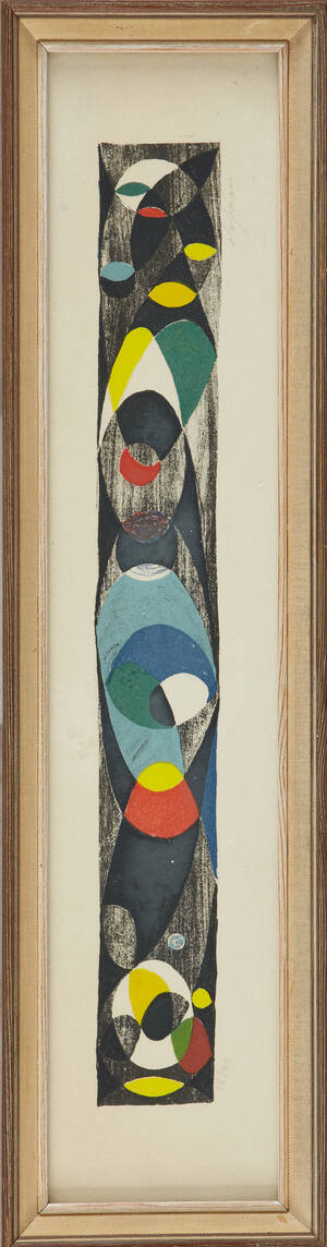 OLOFSSON, Pierre (1921-1996): Komposition, färglitografi, signerad Olofsson, numrerad 18/40, ca 9,5x46 cm. Fläckar och gulnader.