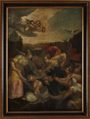 OIDENTIFIERAD KONSTNÄR (Italiensk skola 1600-tal): Figurscen, olja på duk, 106x78 cm. Dubblerad, duklagning, färgbortfall, ytskador.