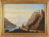 OIDENTIFIERAD KONSTNÄR (1800-tal): Sydländskt bergslandskap med slott, olja på duk, monogramsignerad, 69x95 cm