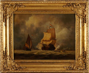 OIDENTIFIERAD KONSTNÄR (omkring 1900): Fartygsbatalj, olja på pannå, 47x64 cm. 243983.