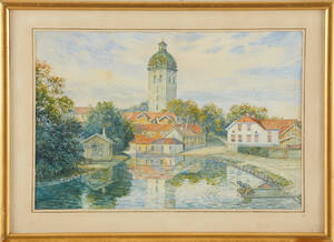 HADAEUS, Johan (1872-1967): Utsikt mot Carolikyrkan -Borås, signerad och daterad Hadaeus 1914, akvarell, 33x49 cm. 237492.