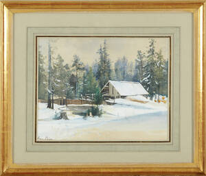 PALM, Anna (1859-1924): Vinterbild med byggnad, signerad Anna Palm, akvarell, ca 26x33 cm. 231432.