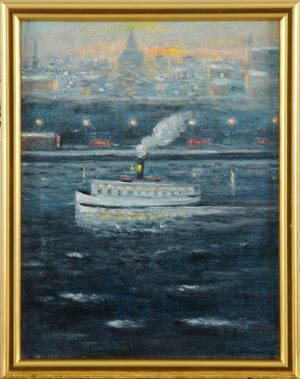 Bengt Fransson (f. 1935), Sverige. Ångbåt på Riddarfjärden. Signerad. Olja på duk, 65x80 cm, yttermått inklusive ram: 70x86 cm. Bengt Fransson, svensk målare född i Läs mer...