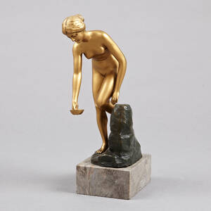 SKULPTUR, på stensockel, märkt Rudolfi, delvis förgylld brons, total höjd 30 cm. Nagg, smärre ytskador, skulpturen ngt lös på sockeln.