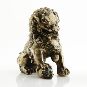 DEKORATIV SKULPTUR i form av fouhund, guldpatinerad vitmetall, höjd 16 cm. 308938.