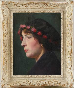 OIDENTIFIERAD KONSTNÄR (1900-talets första hälft): Kvinna med blomsterkrans, olja på duk, ca 35x27 cm. 288473.