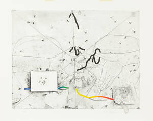 THELANDER, P. G. (född 1936): Komposition med flugor och ansikten, signerad P.G. Thelander, handkolorerad etsning, 24/40, bladmått ca 61x77 cm. Ej ramad.