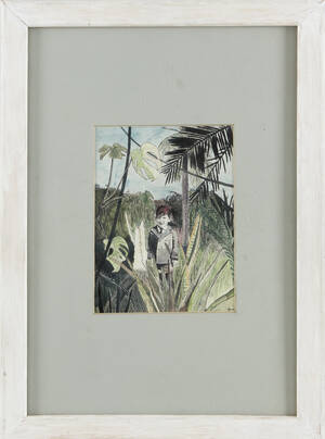 OIDENTIFIERAD KONSTNÄR (1900-tal): "In a Jungle By the Sea", signerad a tergo John Willis, blandteknik, bladmått 18x13,5 cm, rammått ca 43,5x32 cm. 256239.