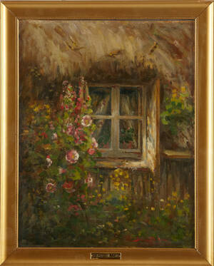 NILSON, Severin (1846-1918): Trädgårdsmotiv, signerad Severin Nilsson, olja på pannå, ca 37,5x29 cm. 239494.