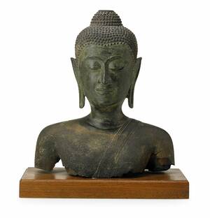 SKULPTUR, brons, 18/1900-tal, Thailand, i form av Buddha, höjd inklusive träsockel ca 27 cm . Slitage, delar saknas.