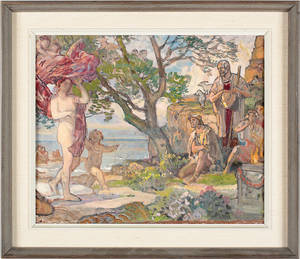 Nils Asplund (1874-1958), Sverige. Josefs upphöjelse, förlaga till skolplansch. Signerad, daterad 1945. Olja på pannå, 80x64 cm, yttermått inklusive ram: 94x77 cm. Nils Asplund, svensk Läs mer...