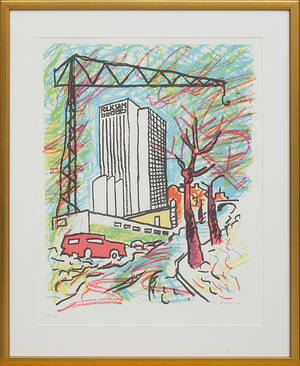Stig Claesson Slas (1928-2008), Sverige. Globen. Signerad, numrerad 122/300. Färglitografi, bildmått: 45x59 cm, yttermått inklusive ram: 49x64 cm. Stig Claesson, signaturen Slas, svensk tecknare, målare Läs mer...