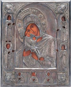 Rysk ikon föreställande Gudsmoder av Kazan. Nizjnij Novgorod omkring 1849-1854. Tillverkad av: Luka Nikolaev Udalov 1835-1848. Savinskij Beniamin V. Tempera på träskiva, Risa i silver Läs mer...
