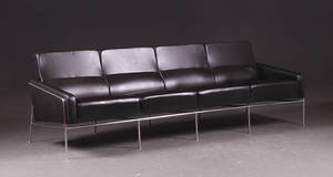 Arne Jacobsen. Fire-pers. lufthavnssofa, model 3304. Stel af forkromede stålrør, fuldpolstret med sort læder. Formgivet 1956 som en del af totalindretningen af Hotel Royal i København. Fremstillet hos Fritz Hansen. Fremstår professionelt betrukket med sort læder og nyt skum. Litt. Carsten Thau & Kjeld Vindum: ' Arne Jacobsen' Arkitektens Forlag, 1998. Gengivet og beskrevet s. 466.Fremstår med mindre brugsspor, enkelt trykmærke.