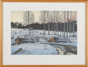 Reinhold Ljunggren (1920-2006), Sverige. Signerad, numrerad 151/360, vårvinter. Färglitografi, bildmått: 48x30 cm, yttermått inklusive ram: 62x42 cm. Reinhold Ljunggren, född 1920 i Vittaryd, död 2006, Läs mer...