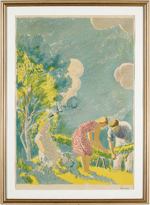 Isaac Grünewald, Figurscen Signerad Isaac Grünewald i blyerts och numrerad 14/40. Litografi bildyta ca 29 x 47 cm. Bladstorlek 44 x 59 cm. Gulnad. Övre Läs mer...