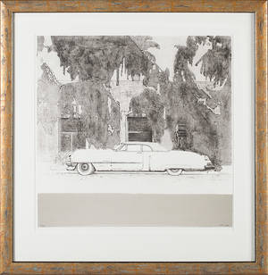 John-E Franzén, Bil i skugga Färglitografi, 1978, signerad III/XV. Bladstorlek 70 x 100 cm. Ej examinerad ur ram, glaset spräckt, gulnat, fläckar. Läs mer...