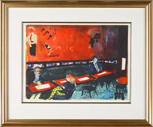 Peter Dahl,"I baren, KB". Färglitografi. Signerad Peter Dahl. Bladstorlek 58 x 86 cm. Ej examinerad ur ram. Vågigt papper. Slitage längst papprets kanter. Läs mer...