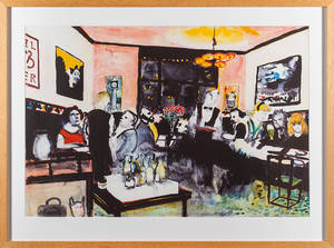 Peter Dahl,"I baren, KB". Färglitografi. Signerad Peter Dahl. Bladstorlek 58 x 86 cm. Ej examinerad ur ram. Vågigt papper. Slitage längst papprets kanter. Läs mer...