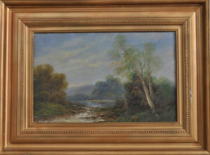 Ubekendt kunstner. Landskab med sø i baggrunden. Olie på papir. Sign. T. Wool. 36 x 56 cm (59 x 89 cm).
