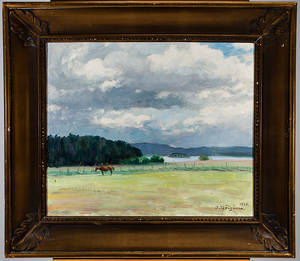 Oki Räisänen 1886-1950. Bonde med harve og hest, olie på plade, sign. samt dat. O. Räisänen 1914. 29 x 37 cm. Läs mer...
