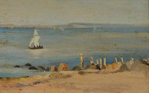 Ubekendt kunstner. Kystparti med sejlbåde, olie på lærred monteret på plade, usign., 15 x 23,5 cm.