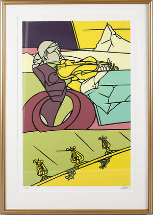Valerio Adami, "Dialogue dans le paysage I" Färgserigrafi, 1988, signerad 135/150. Bladstorlek 94 x 72 cm. Ej examinerad ur ram, saknar glas, smärre skador. Läs mer...