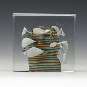 OIVA TOIKKA ÅRSKUB 1982, signerad Oiva Toikka 19/2000, Nuutajärvi 1982, formation i färgat glas innesluten i klart, gjutet glas, sidorna slipade, höjd 7,7 cm. 884152. Läs mer...