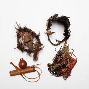 En samling etnografika, bestående af: seks punge af skind, en bemalet træmaske, et trævedhæng i lædersnor, 10 dele div. pletslsølv, to stentøjsfigurer samt en fedtstensskulptur. Läs mer...