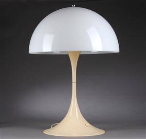 Verner Panton, bordslampa, "Panthella", Louis Poulsen. Vit akryl. Etikettmärkt "Louis Poulsen 123430 Made in Denmark". Skärmens diameter 51 cm. Höjd 70 cm. Obetydligt ytslitage. Ej Läs mer...