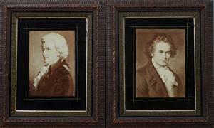 Portrætter af Beethoven og Mozart af ubekendt fotografisk reproduktion, indrammet med hinterglas, rammer af træ og gesso. Slut 1800-tallet. 30x22 cm. (56x46 cm). Enkelte afskalninger og afslag på rammer. (2)