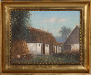 Ubekendt kunstner. Olie på lærred. Bondeeksteriør. Sign. 22 x 28 (29,5 x 35,5) cm.