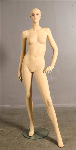 Mannequin/skyltdocka. 'First Class Exposure Line'. Fabrikat: Royal Thai Mannequin. Armar och ben med steglös reglering. Glasfiberförstärkt hårdplast med stålförstärkta leder. Delas i handleder, axlar, midja och ena låret för enkel på/avklädning. Ansikte med handmålad make-up, påklistrade ögonfransar. Används med eller utan peruk (medföljer ej). Stativet fästes under ena fotsulan, alternativt i underbenet för användning med skor. 2 fästen medföljer samt stativplatta av 8 mm härdat glas. H: 175-180 cm. Färg: naturlig ljus hudton. OBS! variationer på armarnas uttryck kan förekomma då flera dockor auktioneras ut och lämnas ut i kartong!