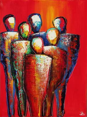 Figurkomposition af Saline Døg (2000-tallet). Akryl på lærred. Sign. monogram. 120 x 90 cm. Uden ramme.