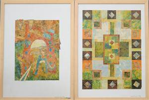 Kompositioner af Karen Berg, indrammet håndmalet papri/collage, sign. K. berg 01, 74x54 cm. (2)