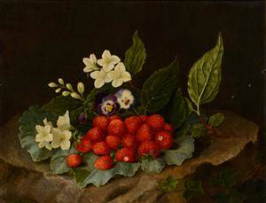 Ubekendt kunstner, olie på lærred. Motiv med bær og blomster. Usign. I.L Jensens skole 1800. 25 x 31 cm. (34x41) cm. Fremstår med krakelering.