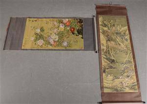 Kinesiske billedruller. Bemalede med gouache m.m.. 1900-tallet. 80 x 240 og 90 x 210 cm.