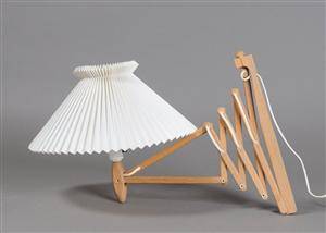 Erik Hansen for Le Klint. Sakselampe af massivt bøgetræ med plisseret skærm af plast. Formgivet 1952. Fremstillet hos Le Klint, model 324-335. L. ca.32-60 cm. Läs mer...