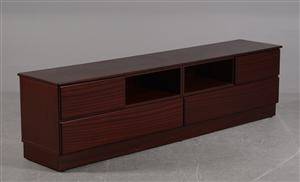 Carpenter. Tv-skænk af udskåret og lakeret mahogni med intarsia, front med 4um og to buede skuffer. H. 44, L. 187, D. 57 cm. Fremstillet hos Läs mer...