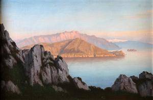 Rasmussen, Eiler Eilersen (1827-1912). Aftensol over bjerglandskab med sø, olie på lærred, sign. E. Eilersen. 36 x 52 (48 x 65) cm. Läs mer...