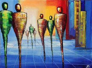 Figurkomposition af Saline Døg (2000-tallet). Akryl på lærred. Sign. monogram. 90 x 120 cm. Uden ramme.