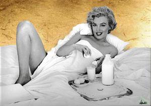 Fredrico de Albinini, blandteknik på duk, motiv av Marilyn Monroe, Breakfast in Bed. Delvis förgylld med slagmetall. Foto samt akryl på djup duk. Mått: 140x100 cm. Signerad. Fredrico de Albinini arbetar i blandteknik där fotot är grunden. Kompositioner bearbetas sedan i Photoshop och kompletteras ofta med akrylmåleri. Han är utbildad ingenjör men har arbetat som fotograf i egen studio och som målerikonservator innan han började som konstnär.