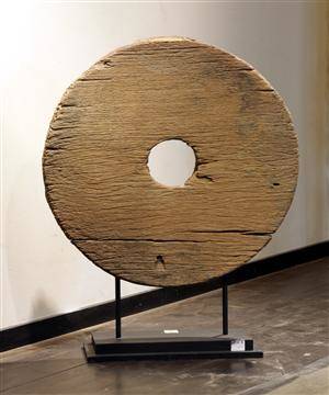 Træskulptur 'Hjul' monteret på sortlakeret sokkel.