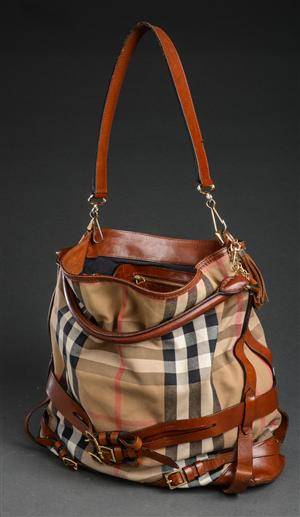 Burberry 'Hobo Media' taske af lærred i klassisk Burberry tern, med skulderrem, håndtag, bund og remme af brunt læder. Indvendigt med talrige rum. H. 36 cm, B. 38 cm, D. 10 cm. Fremstår med lette brugsspor.