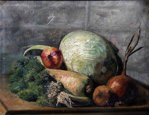 Ubekendt Kunstner. Opstilling med grøntsager på fad. Olie på lærred. Indrammet. 31 x 40. (38 x 47) cm. Ca. 1900.