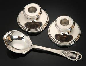 Avslutade auktioner liknande Dansk sølvsmed, et par små moderne lysestager af sølv, en serveringsske (3)