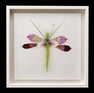 Peter Ericsson (f. 1957) & Linnea Persson (f. 1982), fotografi ?Blomsterinsekt-Untitled?. Signerad samt numrerad 1/ 25. Fine Art Glicée print. Åldersbeständig, syrafri montering i ram. Bladets mått: 40 x 40 cm. Med ram: 50 x 50 cm. Verket har tidigare inte varit ute till försäljning och är därför inte belagt med BUS. Alla har vi nog någon gång fascinerats av både insekters och växters färgrikedom, oförutsägbara kompositioner och utförande. Floristen Linnea Persson har inte bara trollbundits av just detta utan även ställt om skärpan och därmed fått en helt ny värld att växa fram. Plötsligt talade hennes blommor i butiken och ute i naturen ett helt annat språk. Ett ekollon blev en insektskropp och vingar uppdagades i lönnens näsor. Alstromerians mönsterrika kronblad blev fjärilens vingar och gav anthuriumens blomkolv liv. Ett fantasifullt skapande tog form. Fotografen Peter Ericsson kontaktades för att kunna föra projektet vidare. Med Linneas unika design och Peters många år som kvali