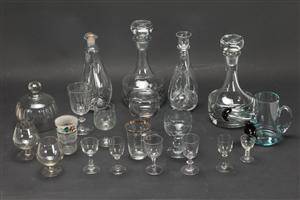 Diverse glas og karafler, delvis prydet med slibninger, bla. Lyngby glas, bestående af 4 karafler, glasklokke, "penisbæger", 2 vandglas, 4 vinglas, 2 cognac glas, 6 hedevinsglas. (20)